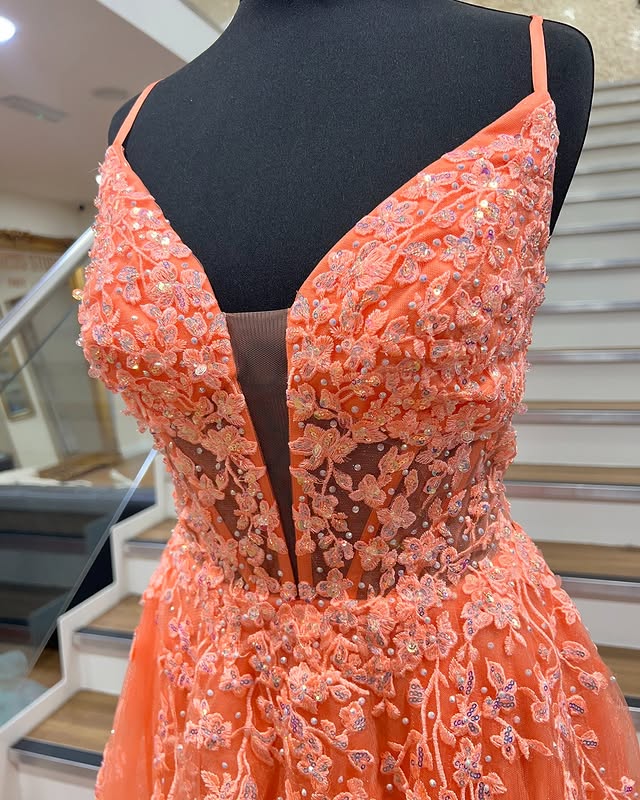 Vibrant orange A-line prom dress with slender spaghetti straps and a daring deep V-neckline. The flowing long skirt moves beautifully with every step, combining elegance and confidence for a radiant, unforgettable prom night look.