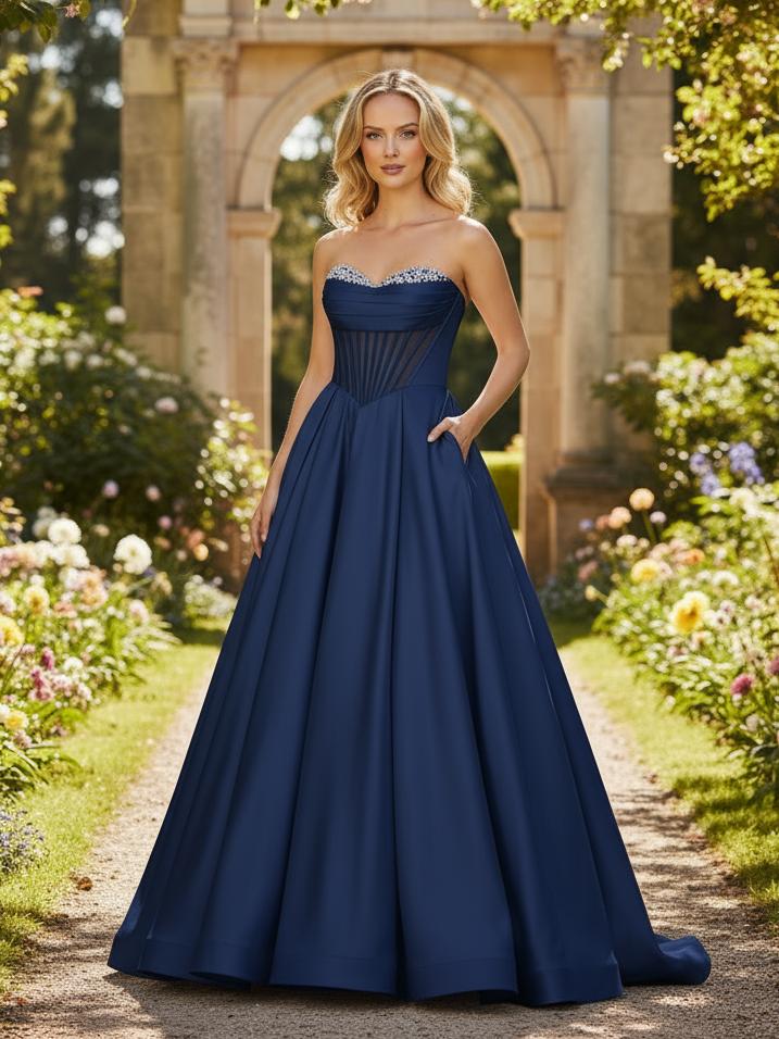 Charming strapless ball gown featuring a sweetheart neckline and convenient side pockets. The long, flowing skirt creates a graceful silhouette, while the fitted bodice flatters your shape—perfect for prom, gala, or any elegant evening occasion.